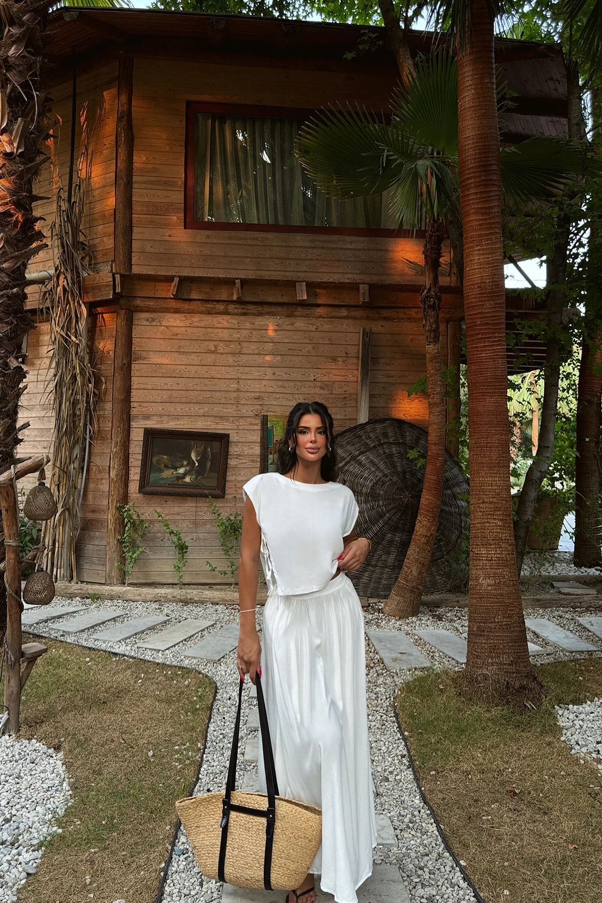White Tie Detailed Suit S size is used in the image. Made of linen fabric. Suit upper length 43 cm, Chest 48 cm, Bottom length 86 cm, Waist 36 cm, Model Measurements Height: 160 Weight: 50 Chest: 80 Waist: 62 Hip: 94