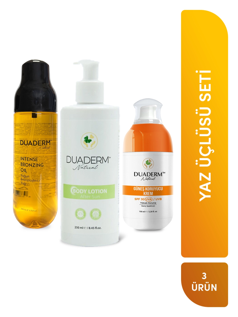 Yaz bakımının olmazsa olmaz üçlüsü! Güneş Kremi, Bronzlaştırıcı Yağ ve After Sun Body Lotion’dan oluşan bu özel set; cildinizi güneşin zararlı etkilerinden korur, sağlıklı bronzlaşmanızı destekler ve güneş sonrası bakımınızı tamamlar. Yaz boyunca ışıldayan ve sağlıklı bir cilt için ideal. Duaderm Güneş Kremi Duaderm Bronzlaştırıcı Yağ Duaderm After Sun Body Lotion